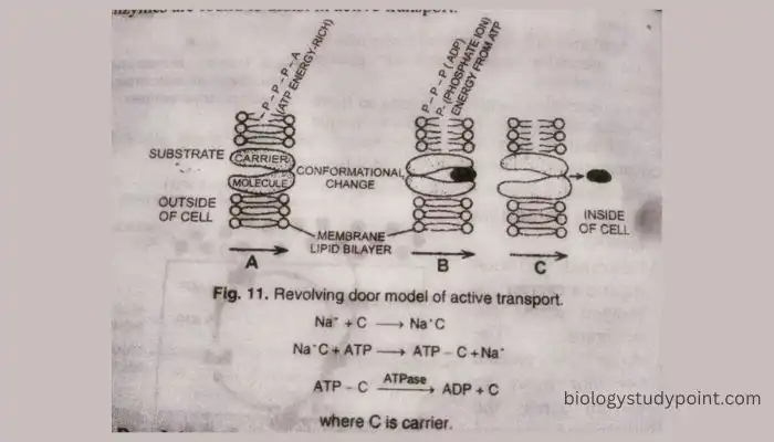 The carrier protein changes its shapes as the substance enters the slot and rotates so that the slot comes to lie on the inner side. The substance is released in the cell and the protein rotates back to its original form. The energy is spent during the process of rotation.